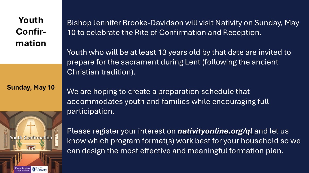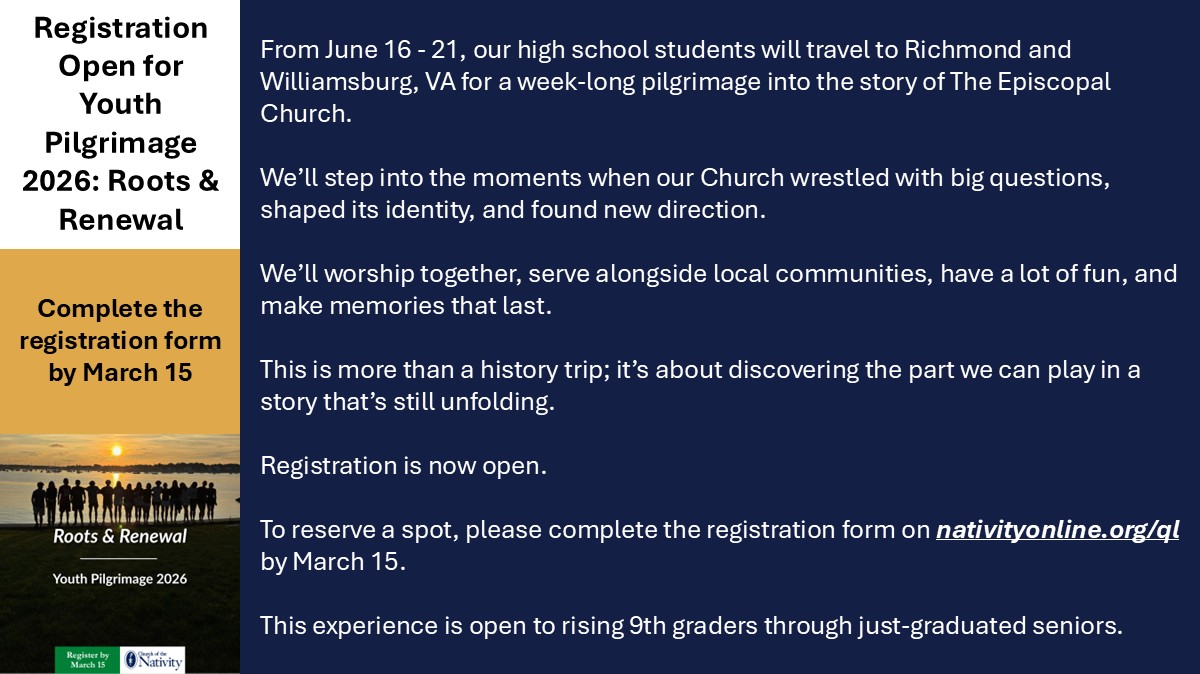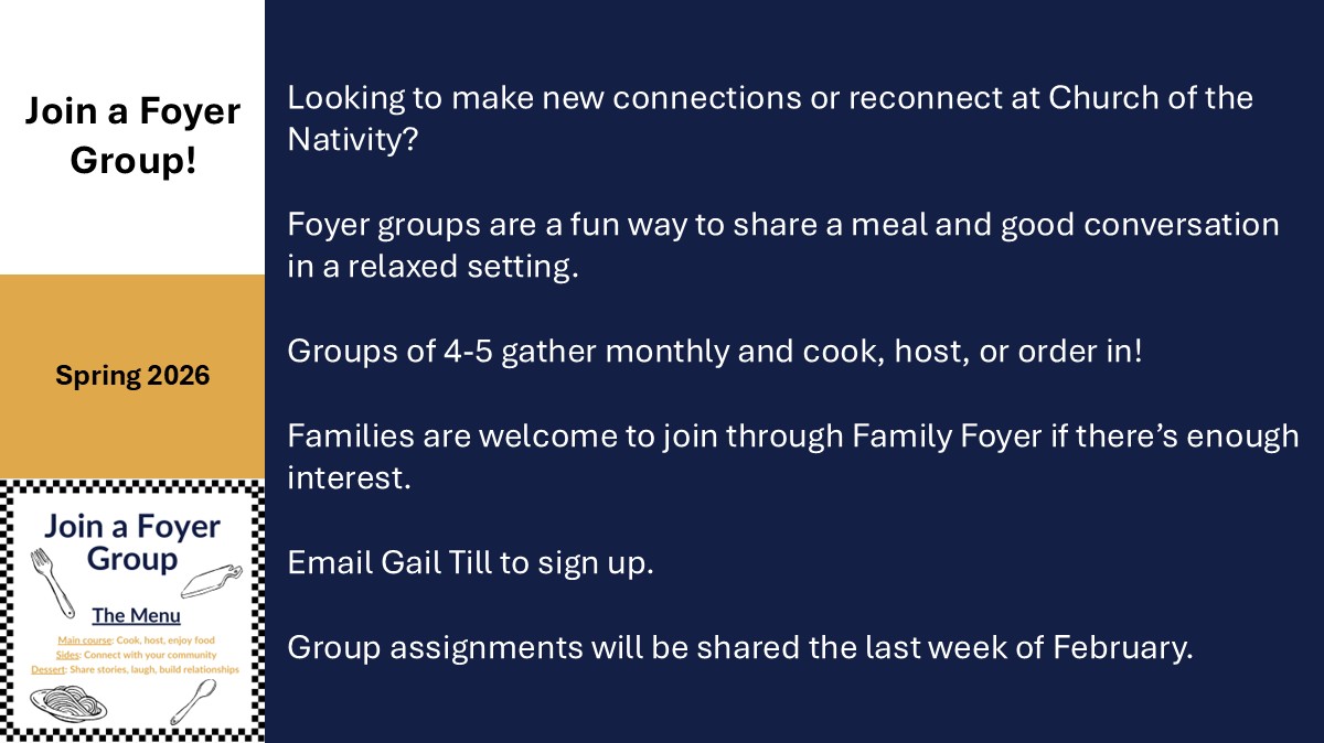Description: Please check your weekly Nativity email for link to access this gathering, or contact the Parish Coordinator at coordinator@nativityonline.org.