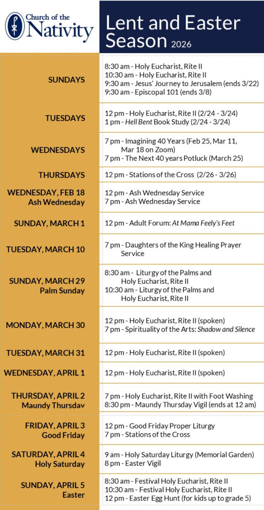 Welcome to Church of the Nativity, a sanctuary in the trees of North Raleigh. No matter where you come from or where you are going, no matter who you are or who you love, you are welcome here.