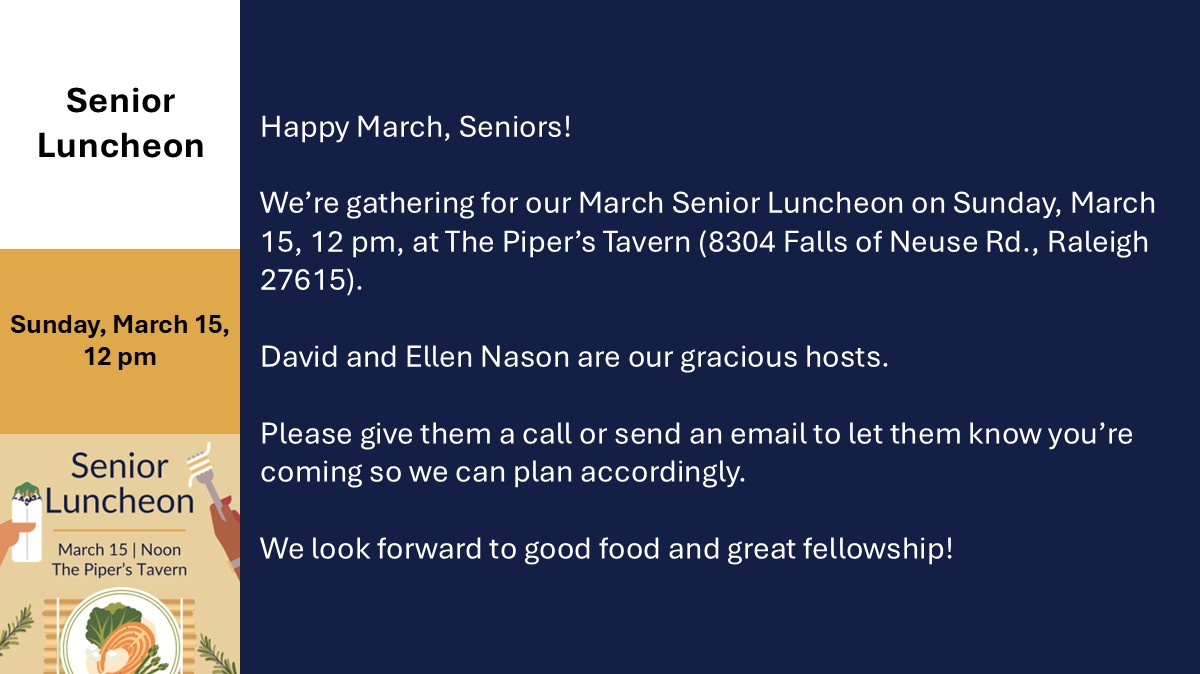 Happy March, Seniors! We’re gathering for our March Senior Luncheon on Sunday, March 15, 12 pm, at T…