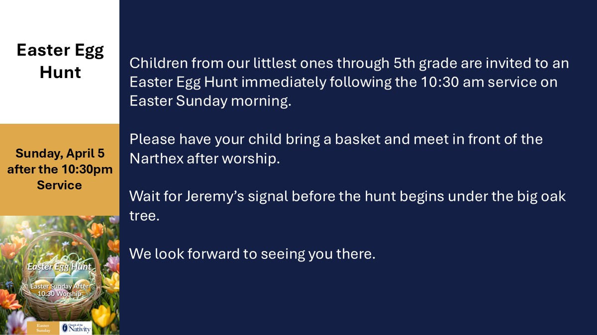 Children from our littlest ones through 5th grade are invited to an Easter Egg Hunt immediately foll…